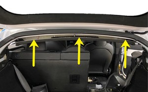 - 보조 작업자의 도움을 받아 차체에서 코트 후크 테더 클립(2개)을 푼 다음 헤드라이너를 받칩니다.