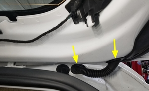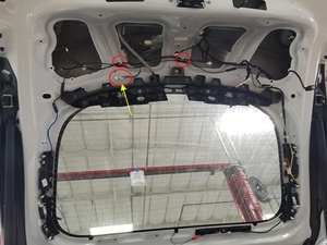 차체와 리프트게이트를 통해 리프트게이트 하네스를 배치한 다음 하네스를 차량에 부착하는 그로밋(2개)을 고정합니다.
