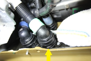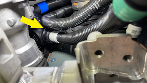 - 클립을 풀고 HV 배터리에서 3방향 밸브-HV 배터리 호스를 연결 해제한 다음 양쪽 피팅에 즉시 플러그를 끼웁니다.