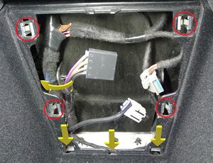 - 90도 플라스틱 트림 공구를 사용하여 센터 콘솔 서비스 패널을 센터 콘솔에 고정하는 클립(4개)을 풀어준 다음 패널을 위로 당겨 하네스에 접근합니다.