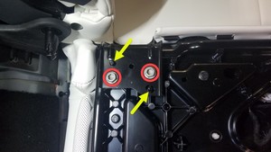 RH 2열 시트 내측 피벗 브래킷을 차량에 고정하는 볼트(2개)를 탈거한 다음 차량에서 브래킷을 탈거합니다.