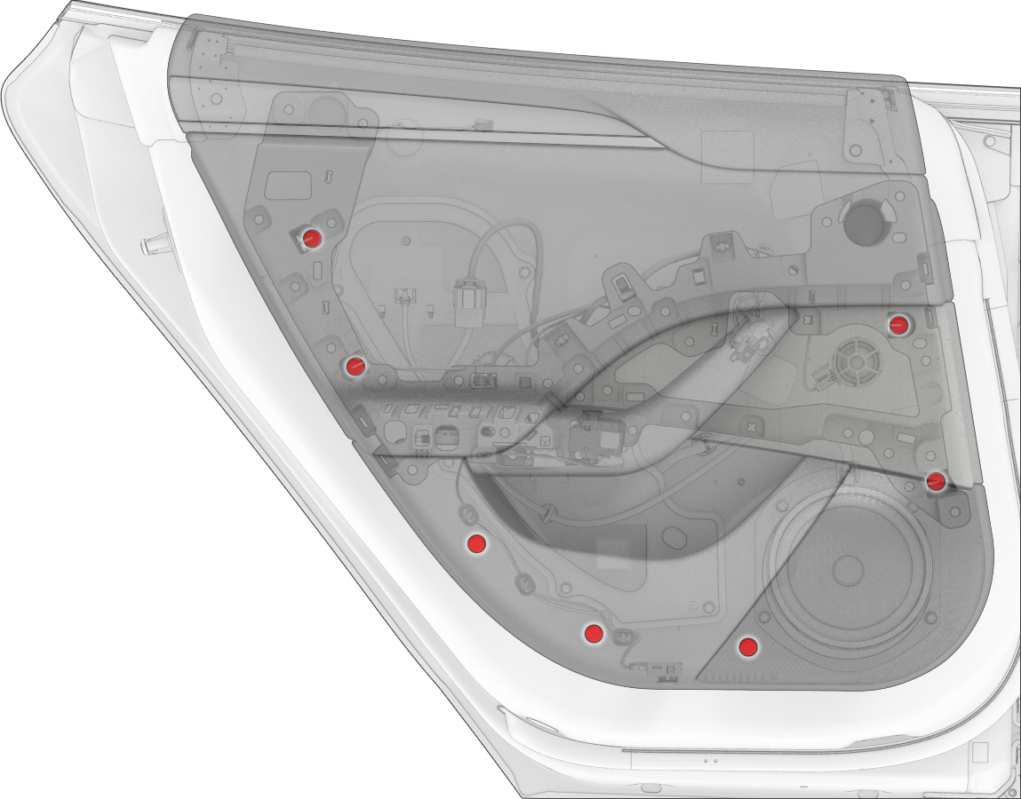 - LH 후면 도어 패널의 상단을 도어 씰에 밀어 넣은 다음 패널 하단을 제자리로 돌립니다. 패널을 도어 어셈블리 안으로 눌러 클립(7개)을 조입니다.