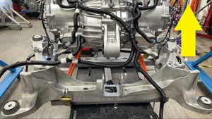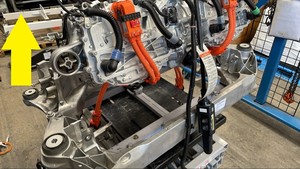 갠트리를 사용하여 구동 장치 슬링 도구를 올리고 후면 서브프레임에서 후륜 구동 장치를 조심스럽게 들어 올려 필요에 따라 후면 서브프레임 전기 하네스와 냉각수 호스를 배치합니다.