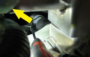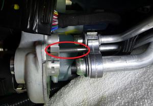 냉각수 호스를 AC 컴프레서 브래킷에 고정하는 클립을 풉니다.