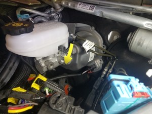 - 가요성 브레이크 라인을 브레이크 오일 저장 탱크 뒤로 이동합니다.