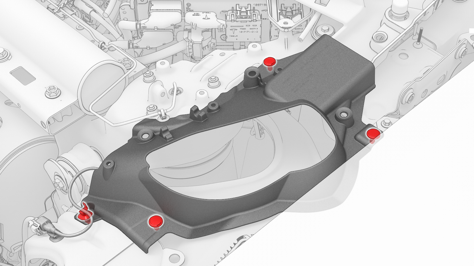 - 후면 후드 내 에이프런을 탈거합니다. 참조 항목: 후드 내 에이프런 - 후면(탈거 및 교체).