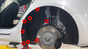 - LH 후면 휠 아치 라이너를 휠 웰에 고정하는 푸시 클립(6개)과 팬 클립(2개)을 배치한 후 고정합니다.