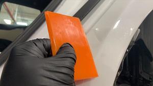 도색 보호 필름이 차량에 제대로 부착한 후 스퀴지를 사용하여 남아 있는 기포를 필름 가장자리 쪽으로 밀어냅니다.