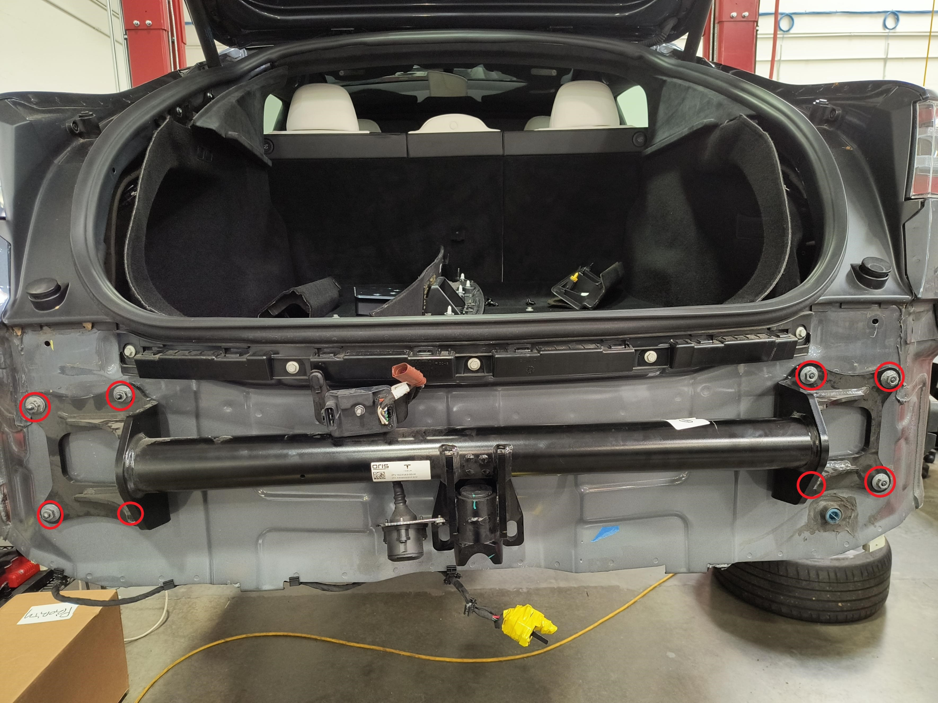 트레일러 히치 어셈블리를 차량에 배치한 다음 히치 어셈블리를 차체 스터드에 고정하는 너트(4개)를 장착합니다.