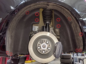 - LH 전면 휠 라이너를 전면 페시아에 고정하는 푸시 클립(5개)을 장착합니다.