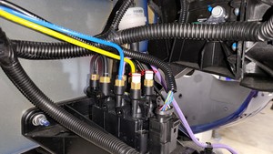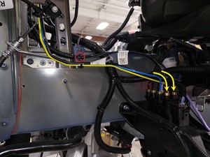참고번들을 차체를 통해 전면 트렁크 영역으로 유도한 다음 슈퍼빔 아래의 번들을 전면 RH 휠 하우스로 유도합니다.