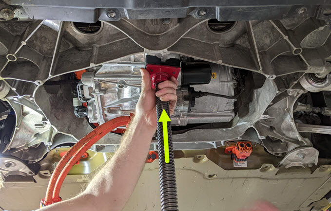 - 클립을 풀고 파워트레인 냉각수 공급 호스를 후륜 구동 장치 인버터 인입구에서 연결 해제한 다음 즉시 양쪽 피팅을 플러그로 막습니다.