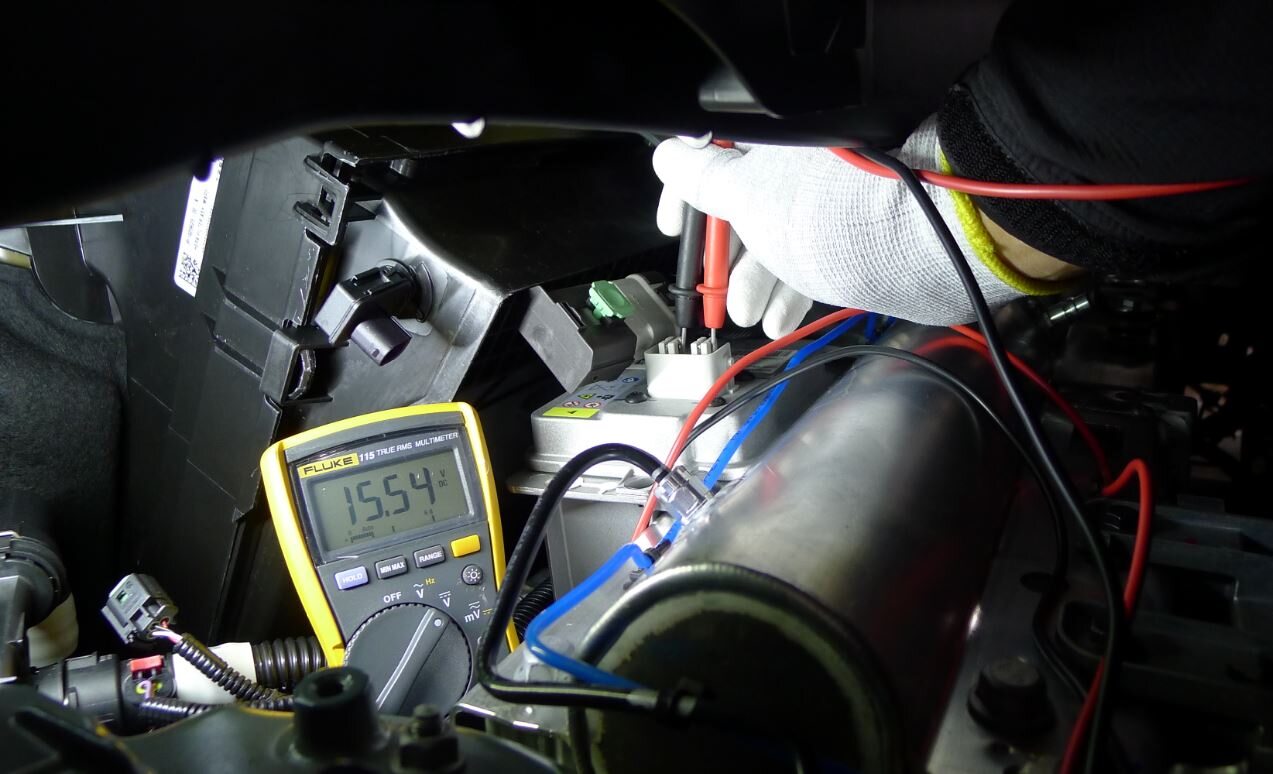고전압 멀티미터를 DC 전압으로 설정하고 프로브를 보조 배터리 커넥터 접점에 살짝 대고 멀티미터에 전압이 표시되는지 확인하십시오.