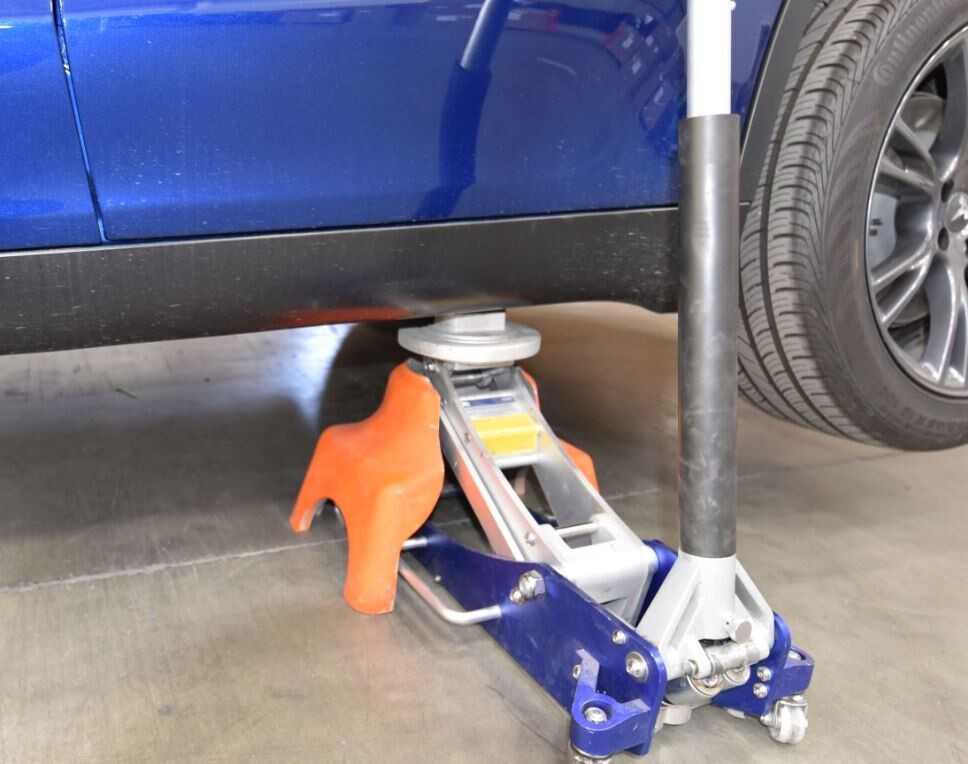 - 将卧式千斤顶放在车辆举升点下方,然后小心地升起卧式千斤顶,将千斤顶支架适配器定位销与车辆举升点上的孔对准。