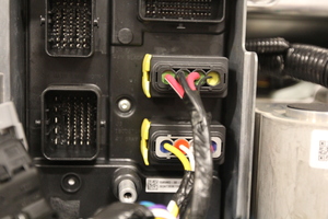 将前车身控制器模块放置到位,以便安装,并将接地电缆固定到支柱塔梁上。