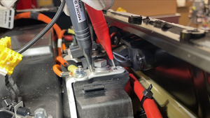 注2 个高压接头;确认使用前仪表已归零;电阻值应小于 0.045 毫欧(45 微欧);如果大于该值,说明高压接头电阻过大。拆卸紧固件,使用异丙醇清洁接触区域,重新安装紧固件,再次测试。
