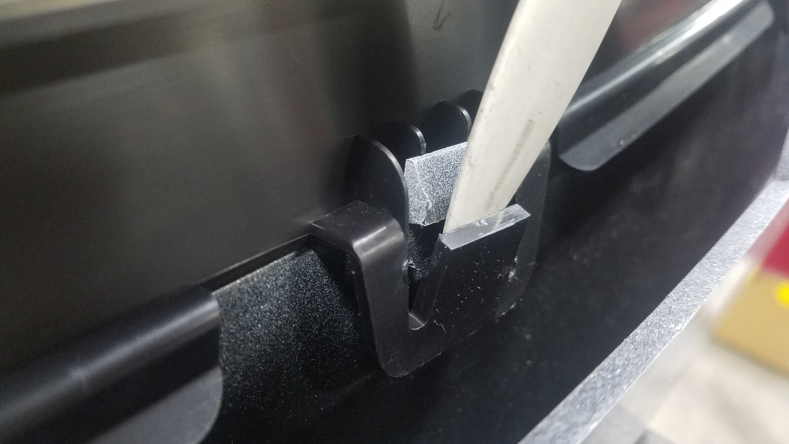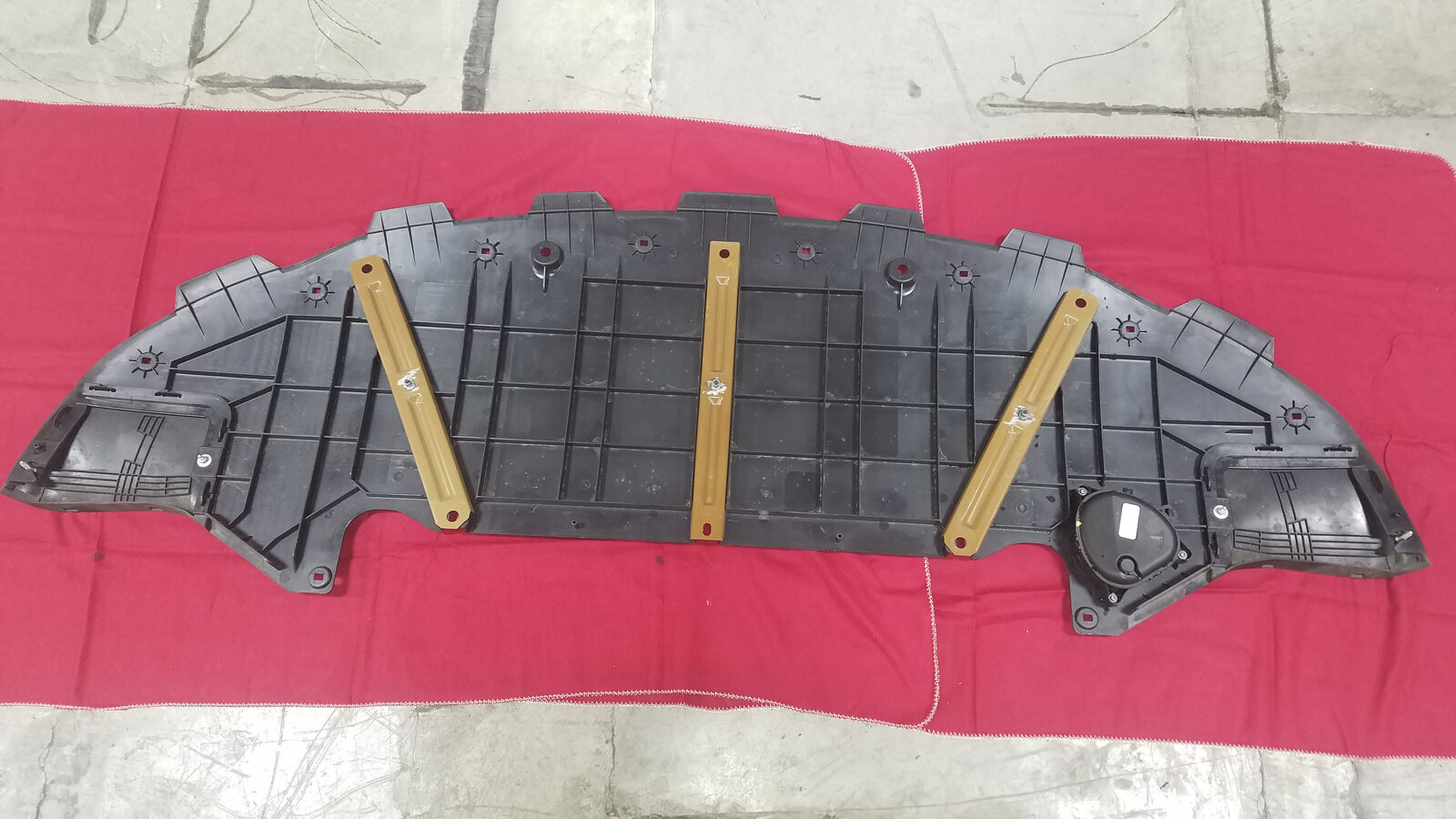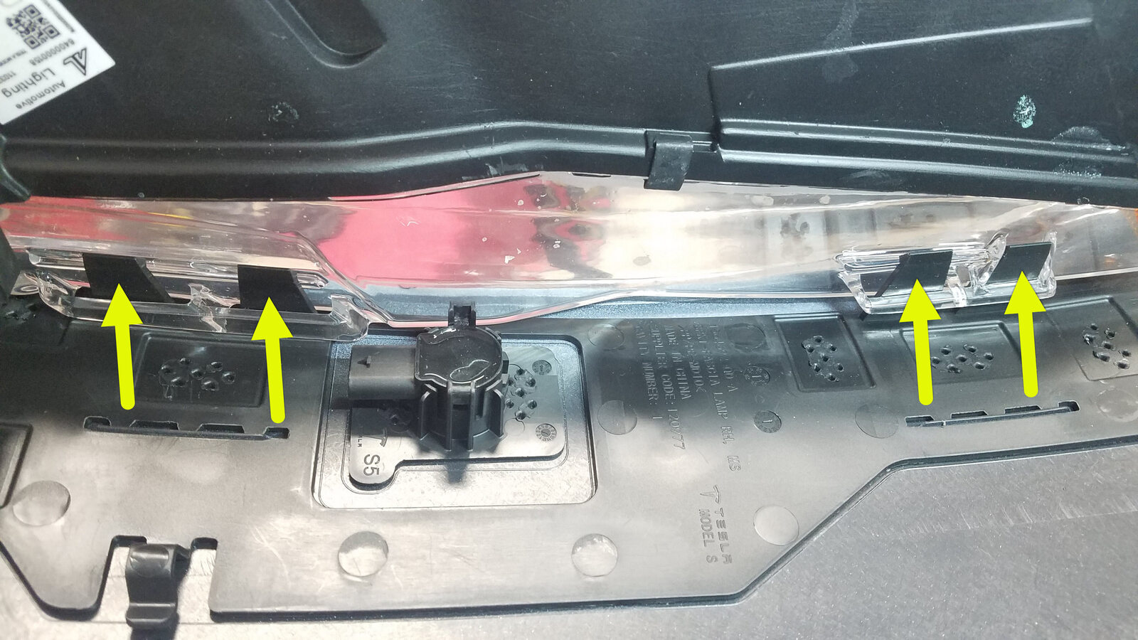 - Fasten the tabs (x4) that attach the T badge support to the front fascia assembly.