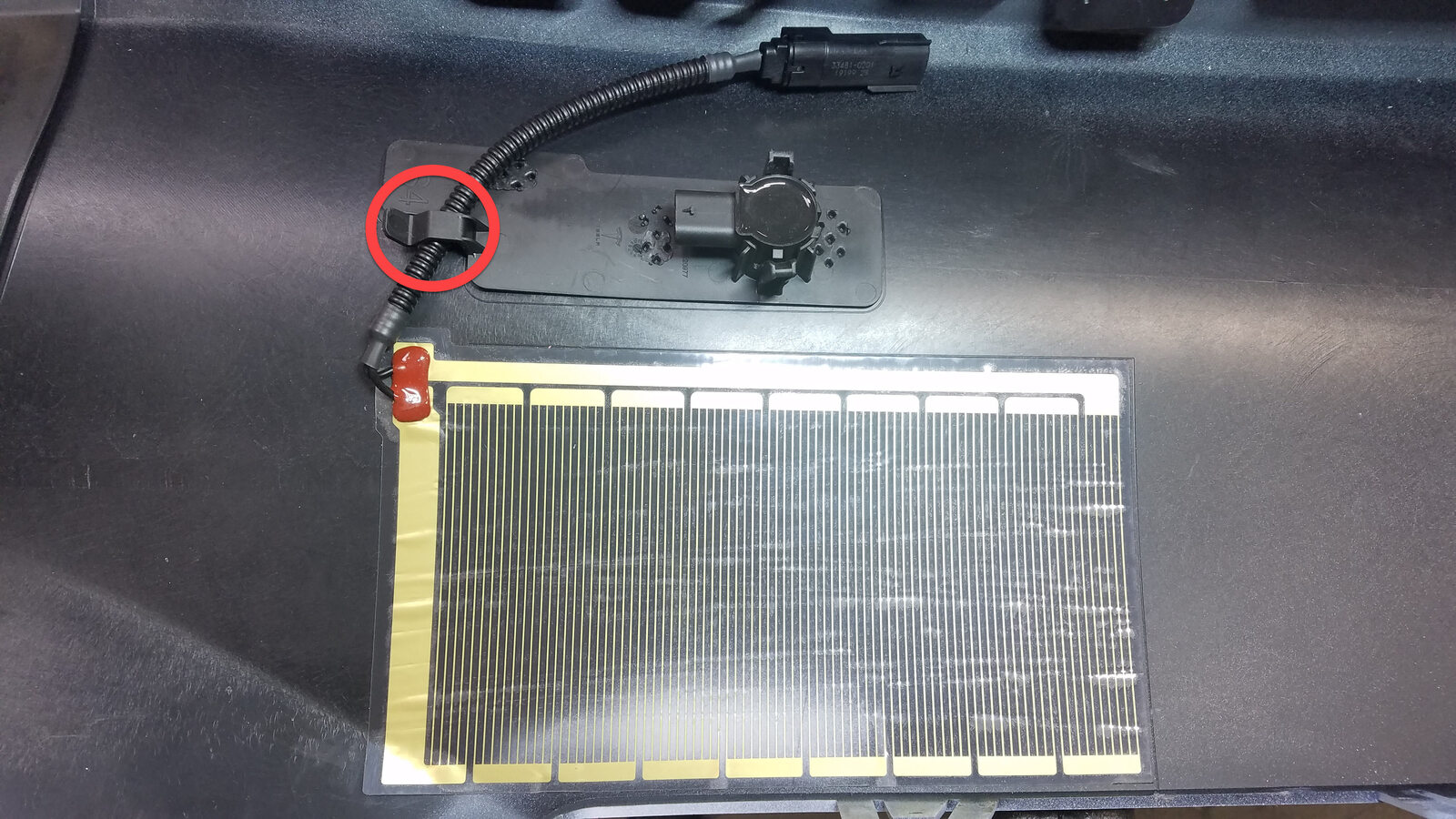 - Secure the radar heater electrical harness with hook.