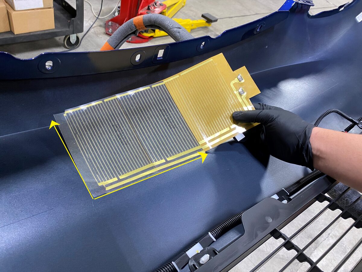 center of the radar heater, align the bottom onto the scribe line, and then adhere the