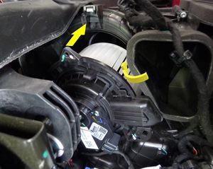 - 断开 HVAC 鼓风机电机电气连接器,然后松开将鼓风机电机线束固定到 HVAC 总成的夹子(2 个)。