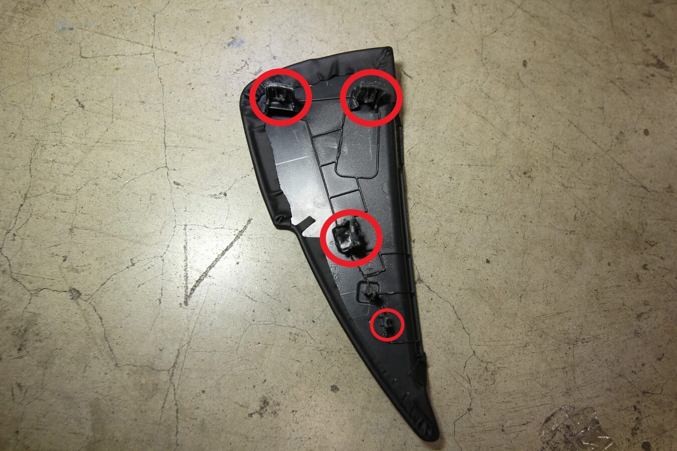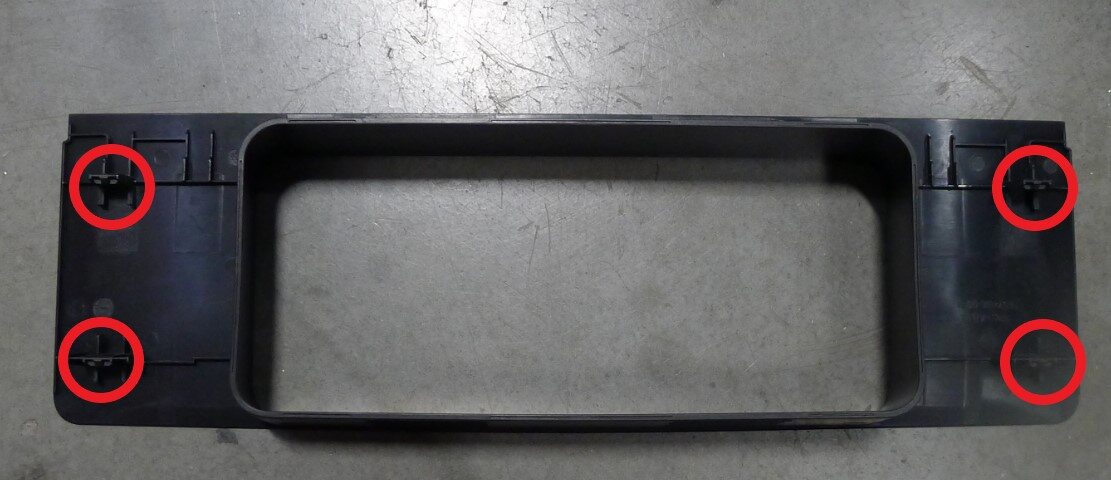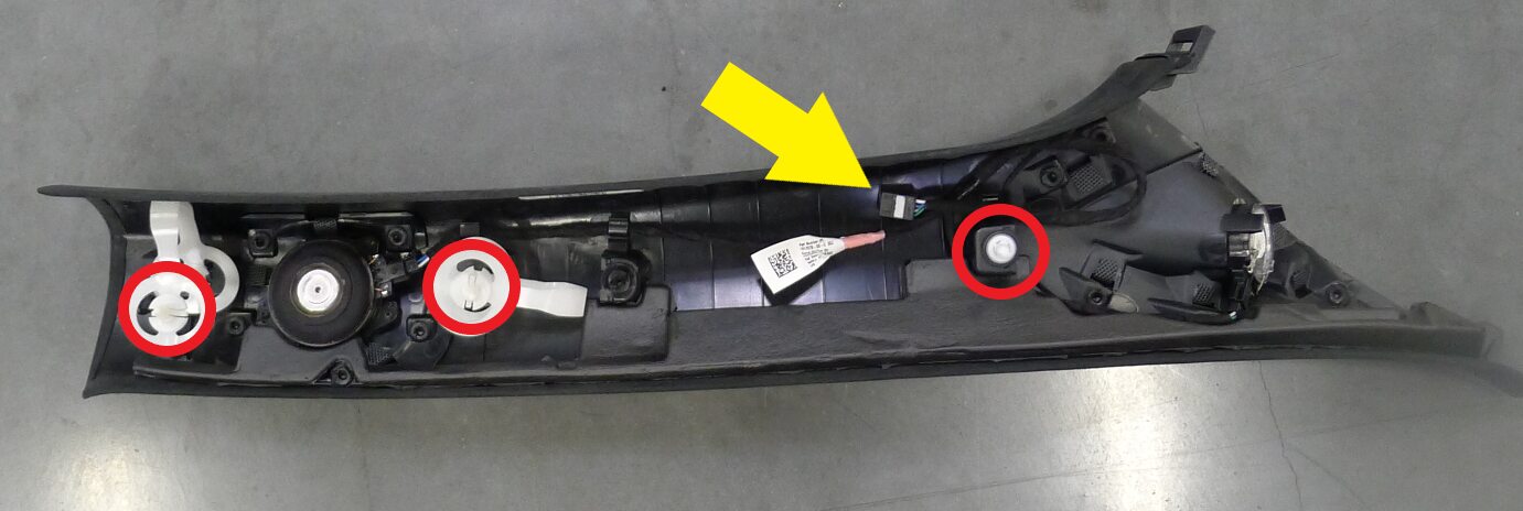 注2x tethered clips, 1x clip, 1x connector, Slide bottom of trim along IP and speaker grill, attach each tether to body side, Set clips starting at the bottom and work up, Pull seal over trim
