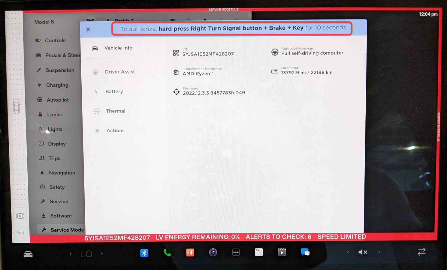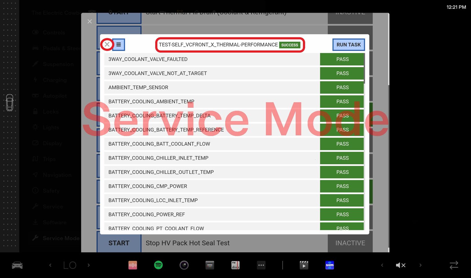 注Select quick controls > Service mode > Diagnostics > Thermal, Authorize routines by holding right turn signal, depressing brake pedal for 10 seconds with key on phone dock