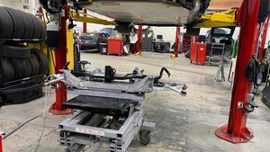 - 降下副框架举升机,断开车间用供气装置,然后将副框架举升机从车辆下方移出。