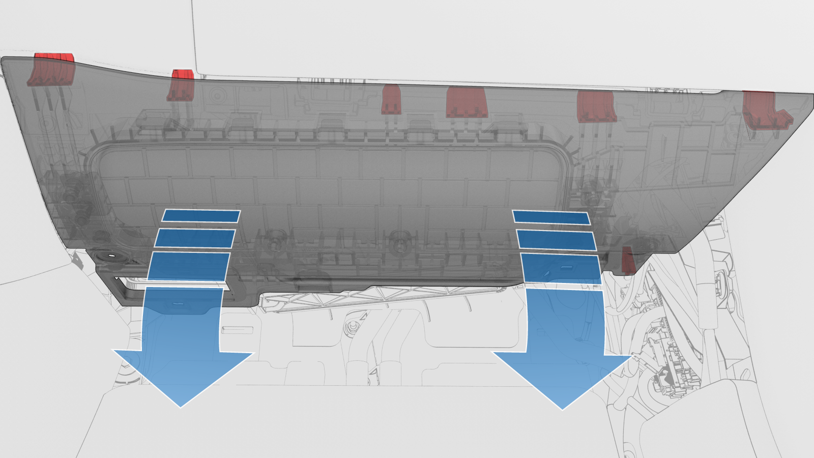 - 勾上锁片(6 个),将副驾位膝部气囊放到仪表板上,然后将气囊固定到仪表板。