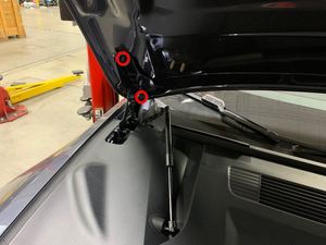 在助手的帮助下,将右侧前备箱盖支柱支架放置到前备箱盖上,然后安装将支架固定到前备箱盖的螺母(2 个)。对左侧前备箱盖支柱支架重复此步骤。15 Nm (11.1 lbs-ft)提示: 推荐使用以下工具: