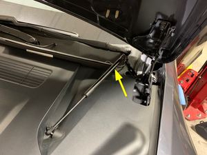 在助手的帮助下,拆下将左侧前备箱盖支柱支架固定到前备箱盖上的螺母(2 个),然后将前备箱盖支柱放在一侧。对右侧前备箱盖支柱支架重复此步骤。15 Nm (11.1 lbs-ft)提示: 推荐使用以下工具: