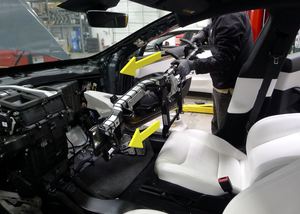 在助手的帮助下,将横梁总成放入车辆。