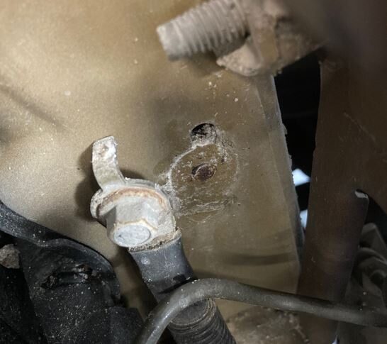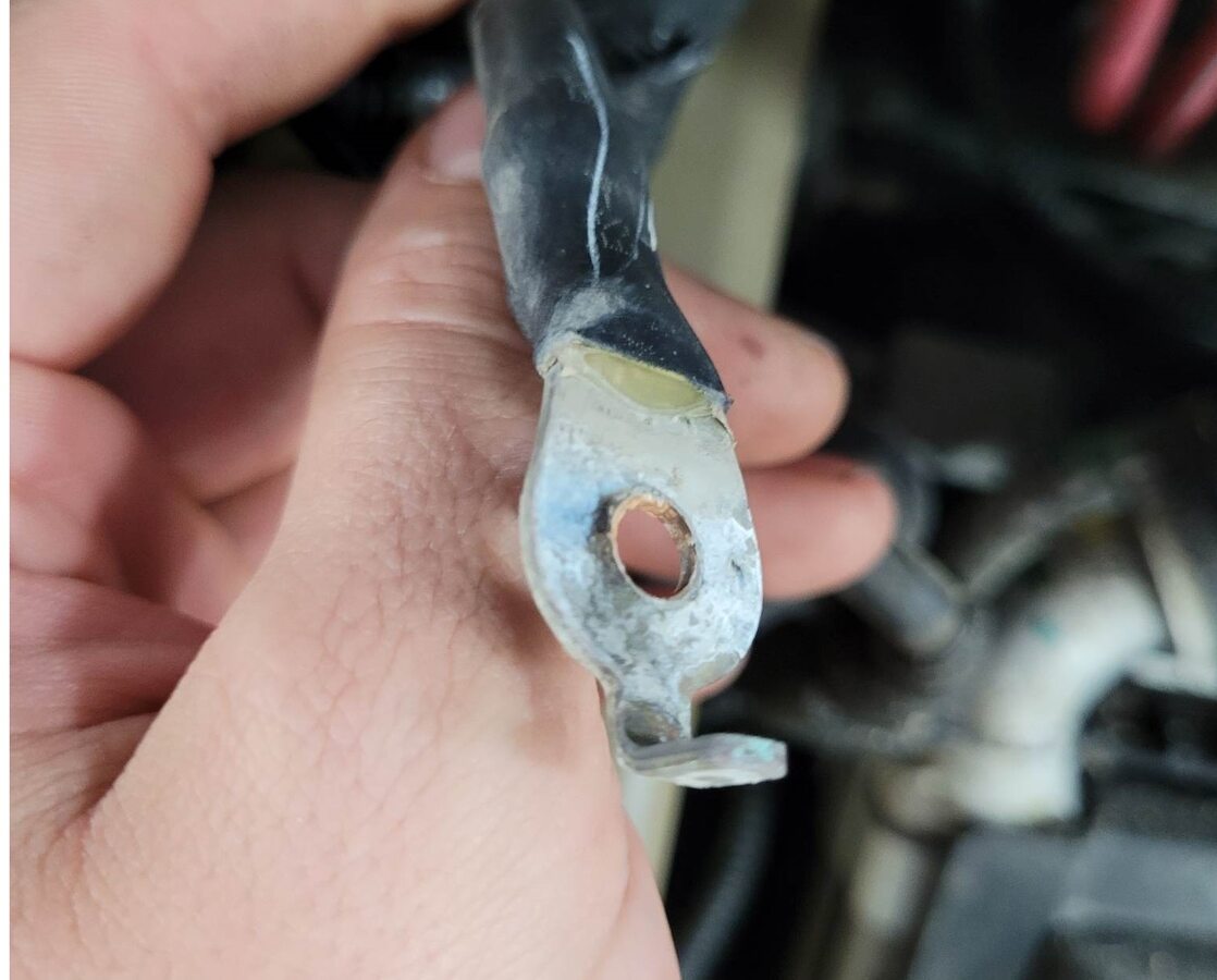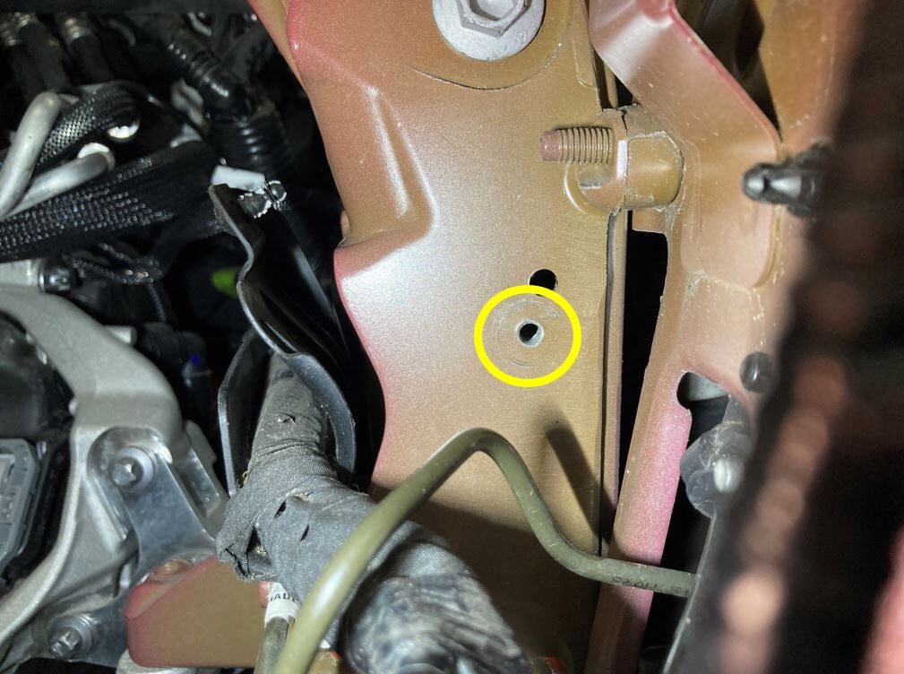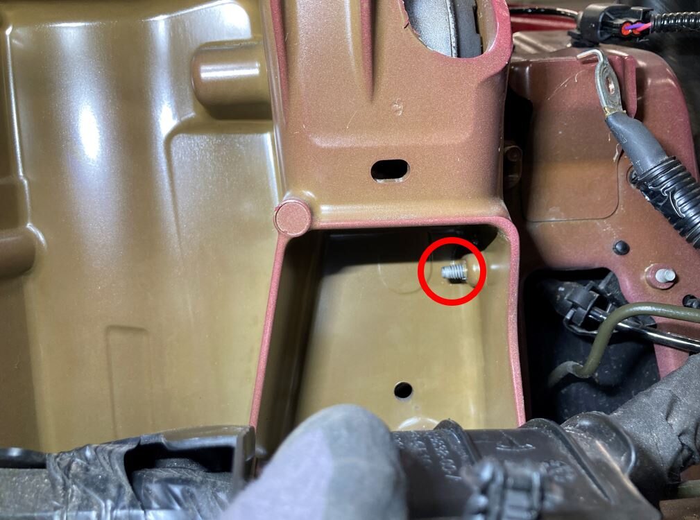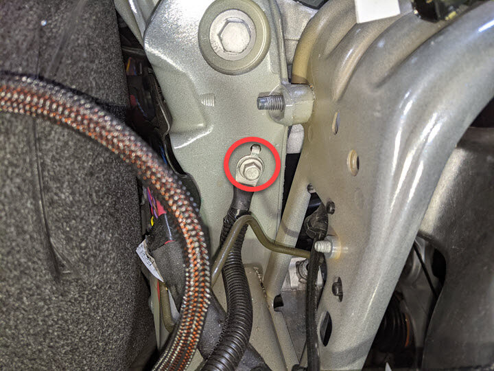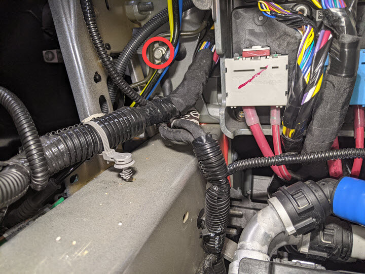 - Remove the broken bolt head from the frunk harness ground terminal G625.