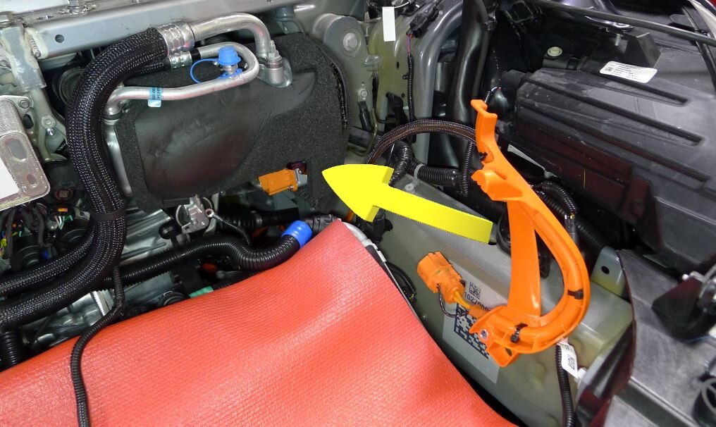 - Release the clip that attaches the frunk harness front guide to the LH side crash rail.