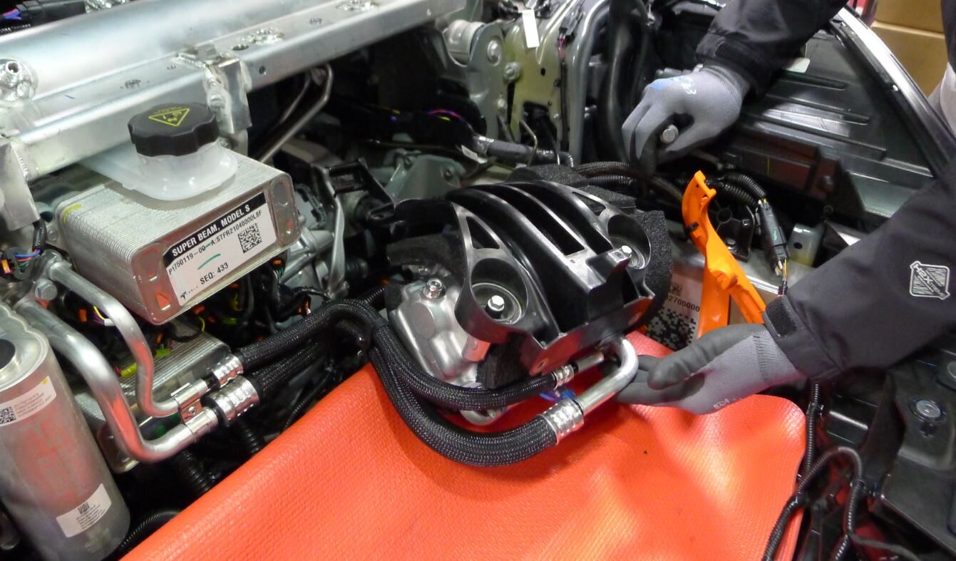 - Install the bolt that attaches the A/C compressor HV harness bracket to the A/C compressor (torque 9 Nm).