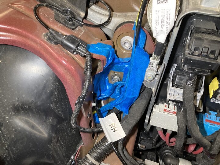 - Remove and discard the bolt that attaches the frunk harness ground terminal G626 to the RH crash rail.
