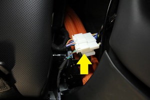 注2 个卡子,2 个连接器;打开锁夹,抬起座垫;断开连接;如果第二排座椅已向下折叠,将其暂时移至一边