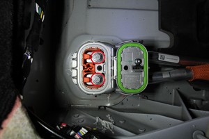 注2 个连接器;首先固定紧急响应回路;放置好低压电池连接,并将黑色连接器锁向内推以将其固定;完全就位后接合灰色锁片
