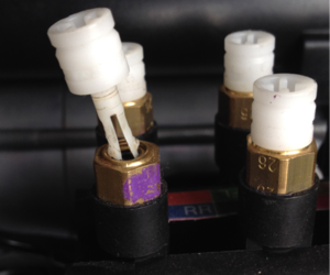 注将软管压入接头,直到标记与接头的顶部对齐。注执行推拉测试,验证管路已正确固定。