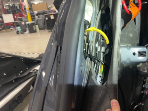 注将右侧后车门闩锁穿过轮罩隔板,并将闩锁放在一旁。 -