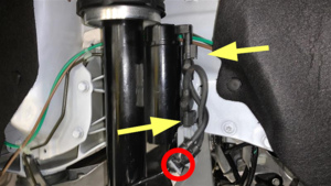 - 断开电气线束连接器(2 个)和线束与左侧后主动减震器的连接。
