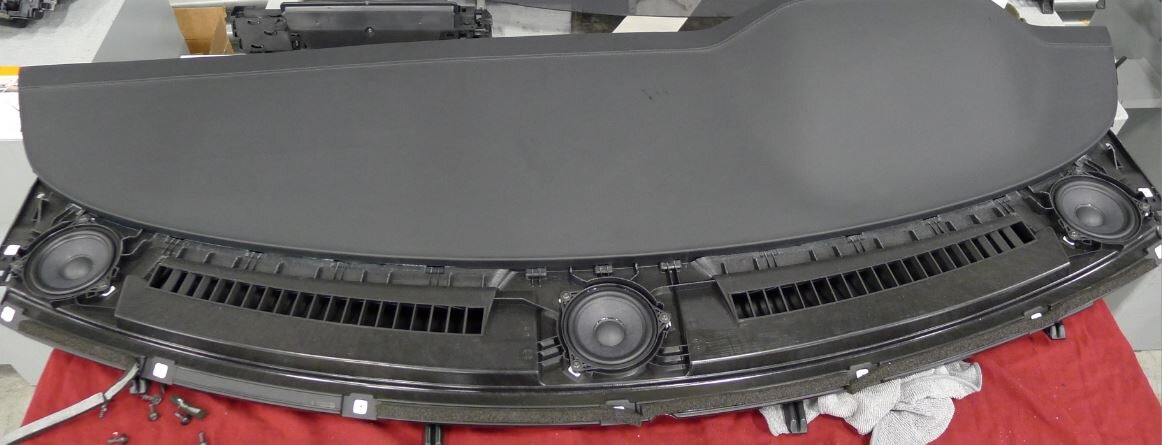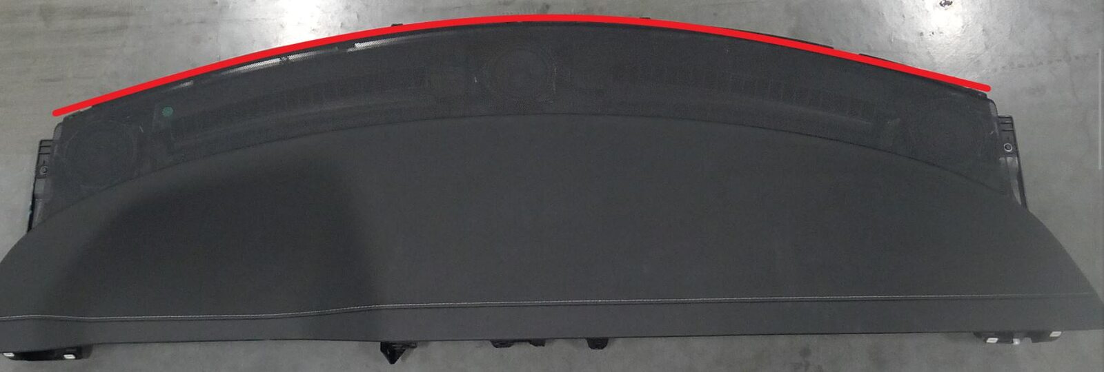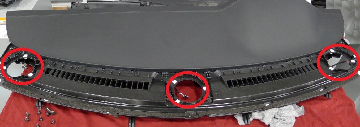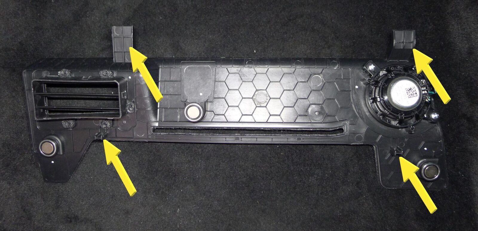 注2x tethered clips, 1x clip, 1x connector, Slide bottom of trim along IP and speaker grill, attach each tether to body side, Set clips starting at the bottom and work up, Pull seal over trim