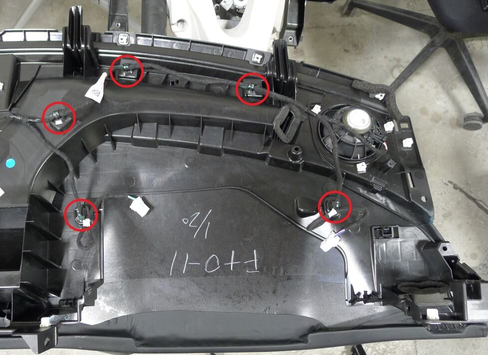 注21x clips, 6x datums, 4x connectors, Connect ambient bright harness, Secure each IP decor connector clip to IP carrier, Secure IP decor to lower instrument panel