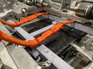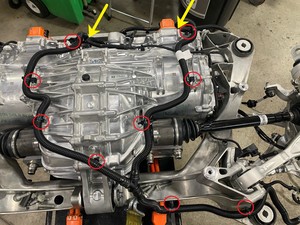 将后驱动单元左右高压线束安装到后驱动单元上,然后安装将后驱动单元高压线束固定到后驱动单元上的螺栓(2 个)。6 Nm (4.4 lbs-ft)