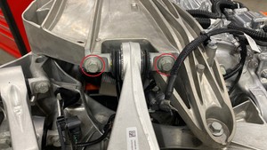 - 降低后驱动单元吊索工具,以便安装并手动拧紧将后驱动单元固定到后副车架后部的螺栓。