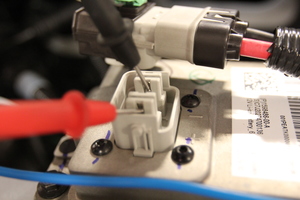 将高压万用表设置为直流电压,用探针轻触辅助电池连接器触点,并确认万用表显示电压。