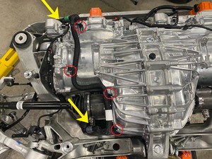 - 将动力总成冷却液回流软管安装到后驱动单元上,然后紧固将软管固定到驱动单元的卡子(3 个)。