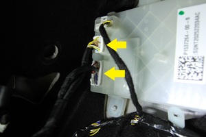 - 松开卡子(2 个),断开电气连接器,然后将充电接口电子控制单元 (ECU) 与电子控制单元 (ECU) 支架一同从车上拆下。
