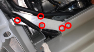 - 紧固将电气线束和 HVAC 排放管固定到右前车架纵梁上的卡子(3 个)。