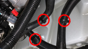 - 松开将电气线束和 HVAC 排放管固定到右前车架纵梁上的卡子(3 个)。