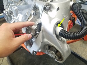 拆下塞子,将逆变器至油冷却器软管连接到后驱动逆变器,然后安装弹簧夹。